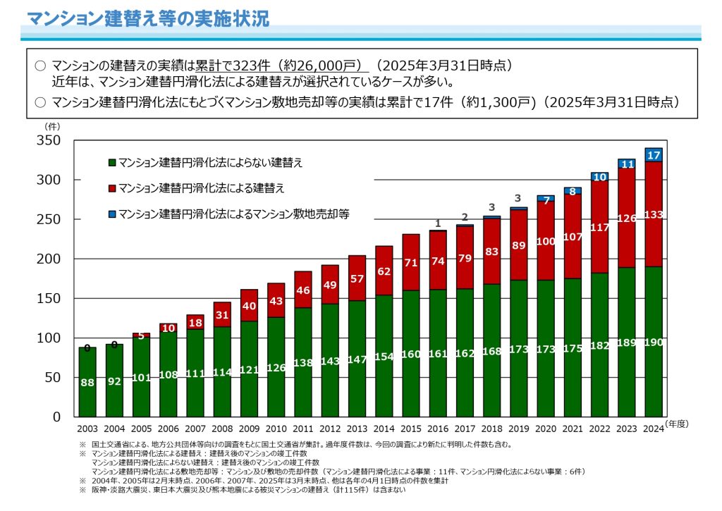 旧制度ではマンションの建て替えについて特に合意形成を得ることが難しく、2025年3月末時点で、実際に建て替えを行ったマンションの累計は323件(約26,000戸程度)に留まっているのが実態です。
