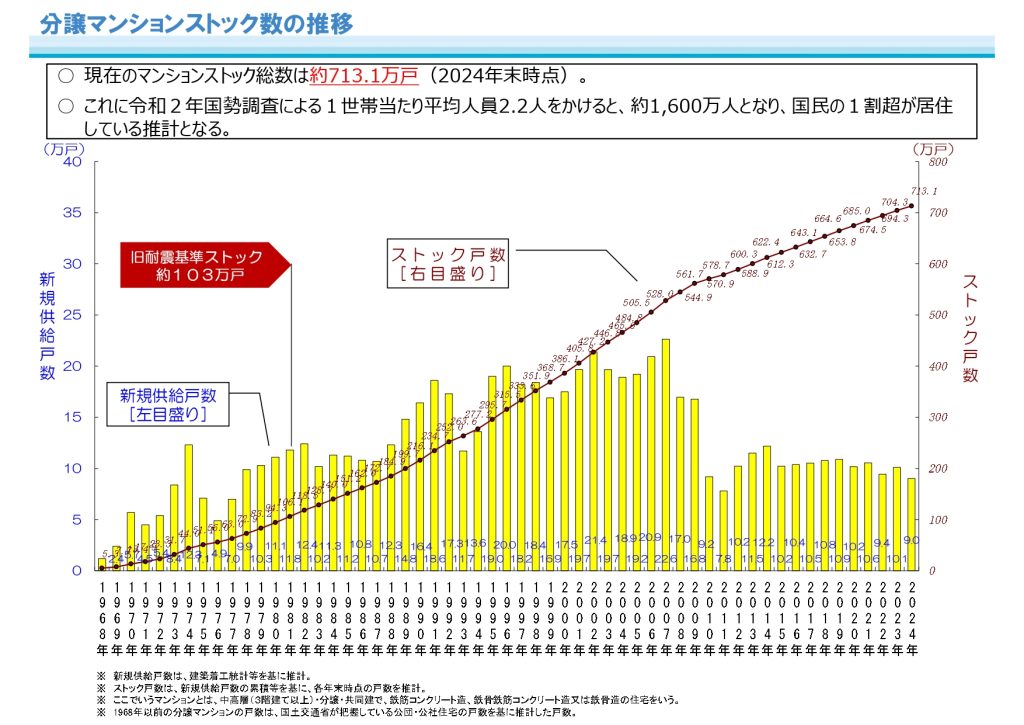 国土交通省のデータでは、全国のマンションの総戸数は2024年度末時点で約713万戸、約1,600万人が居住していると言われています。