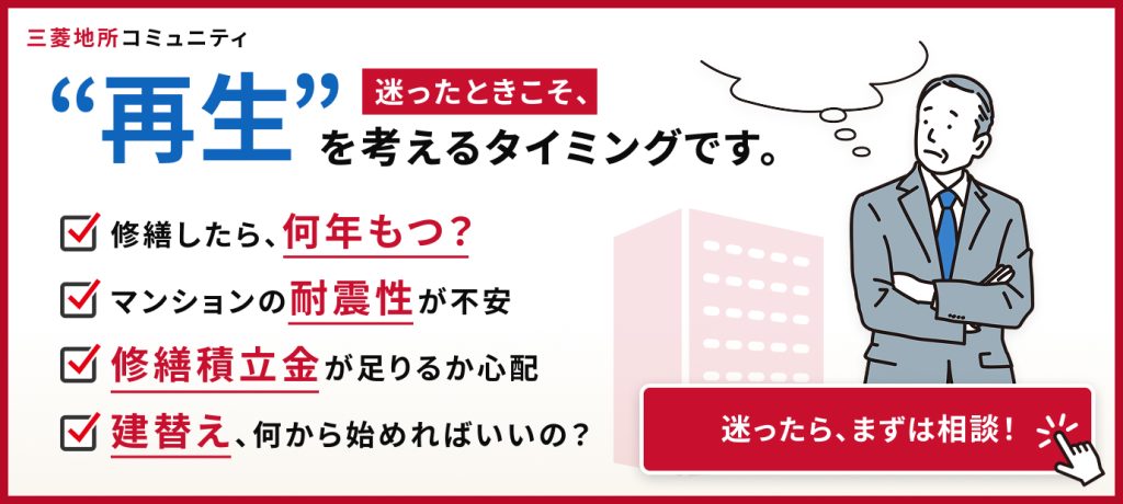とはいえ、建て替えを含めたマンションの再生について検討していく作業は、管理組合だけで行うのはかなりハードルが高いでしょう。 マンション再生検討の支援業務については、一般的な管理会社の場合、業務範囲対象外となりますし、そもそも専門性の高い建て替えや敷地売却、一棟リノベーションに関する知見も持ち合わせておらず、対応できないケースがほとんどです。 それでは、ほかのマンションの場合どうしているのか。 多くのマンションの場合、建て替えを事業として展開しているデベロッパーに相談します。 建て替えを希望する区分所有者が多いマンションや、容積率に余裕があり再建後に住戸数をたくさん増やすことができそうなマンション、立地条件の希少性が高いマンションなど、デベロッパーとしても事業性が高そうなマンションの場合は、デベロッパーへの相談で問題ありません。 しかしながら、建て替え以外の選択肢も検討したい、という場合はデベロッパーに相談するのは適切ではありません。 建て替え以外の提案を受けられる可能性は極めて低いでしょうし、そもそも事業性が低そうなマンションの場合は相談にすら乗ってもらえない可能性もあります。 「じゃあ、どこに相談したら良いの?」 そんな際は、ぜひ三菱地所コミュニティにご相談ください。 当社では管理会社としては非常に珍しく、管理組合向けの再生コーディネート業務を行っております。 【三菱地所コミュニティの再生コーディネート業務とは?】 主な業務内容は以下の通りです。 ・区分所有者の皆様に再生の選択肢について知識を深めていただくための勉強会の開催 ・延命を目指すべきか、建て替えや敷地売却の方向に向かうべきか判断を行えるための資金面のシミュレーション ・各区分所有者との個別面談による合意形成支援 管理会社ならではの管理組合に寄り添った中立的な立場でしっかりと検討の伴走をしていきます。 もちろん、方向性が決定したあとも管理組合の方針に基づき、最後までご支援させていただきます。 詳しくは以下のサービス紹介をご覧ください。 三菱地所コミュニティが管理業務を受託していないマンションでも対応していますので、お気軽にお問い合わせください。